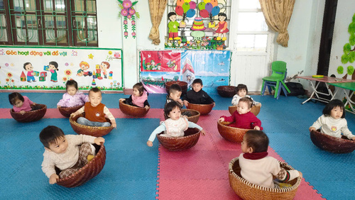 Thông qua hoạt động các bé được cảm thụ theo tiết tấu nhanh – chậm thông qua ngữ thông qua những bản nhạc, những dụng cụ như: thuyền thúng, xắc xô.